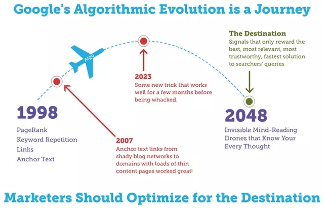 问题是,所有的SEO“捷径”(从关键词堆砌到垃圾链接建设)都是和谷歌服务用户的目标背道而驰的,而且降低了谷歌对大众的吸引力。糟糕的搜索结果会导致用户使用其他搜索引擎,这就伤害到谷歌的底线了。